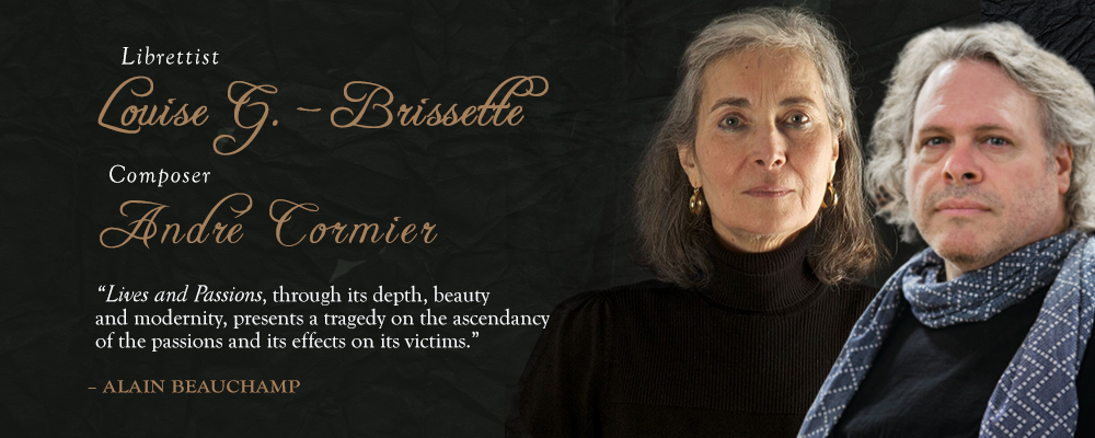 BIO:Louise G.-Brissette is a Canadian writer. She tries to analyse human being, and her thought leads us into the deepness of the soul. In her opera, which is entitled Lives and Passions, she asks the characters to move a lot on the stage as she is a former athlete. André Cormier composed the music of the opera Lives and Passions. André’s work has been presented in Canada, the US, Europe, and New Zealand. He has written for solo, small and large chamber ensembles, as well as music for opera, dance as well as collaborative work with visual artists. PRESS:“Lives and Passions, through its depth, beauty and modernity, presents a tragedy on the ascendancy of the passions and its effects on its victims. Composer André Cormier and librettist Louise G.-Brissette want to share the results of their eleven years of work by staging six excerpts from the complete opera, lasting about thirty minutes, which will be performed publically for the first time.” L’Écrivain public, Thursday February 18, 2010 – Vol. 22, No. 9, p. 24 |